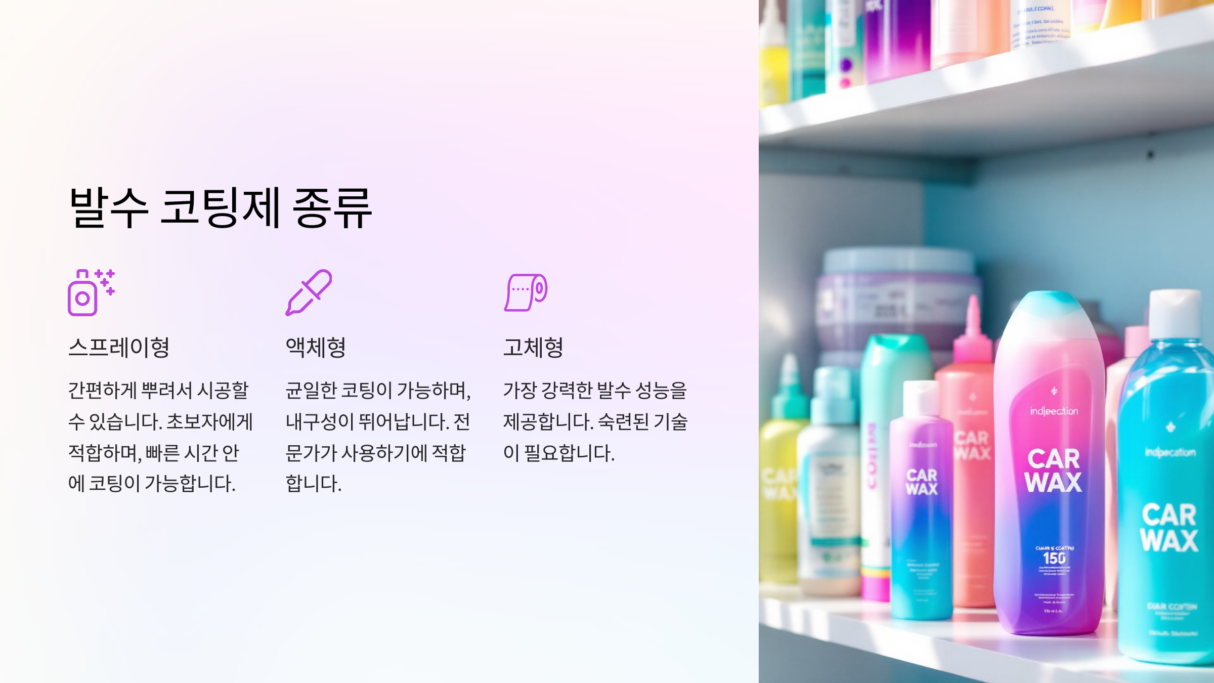 🚘 자동차에는 발수 코팅이 더 적합하지만, 샤워 부스나 창문에는 친수 코팅이 유용해요. 상황에 맞게 선택하면 더 효과적으로 사용할 수 있어요!